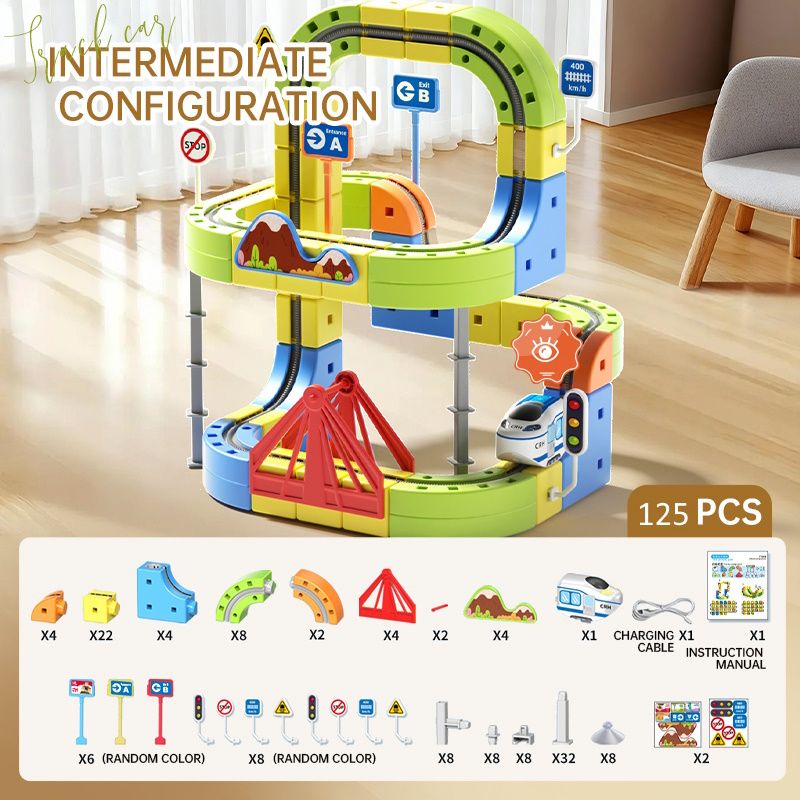 125 pcs Rail Train Set 3D Embedded Race Track Gravity Defying Motorized Car Rail Cube DIY Montessori Sensory Building Toy 125 Pcs STEM Christmas Birthday Gift