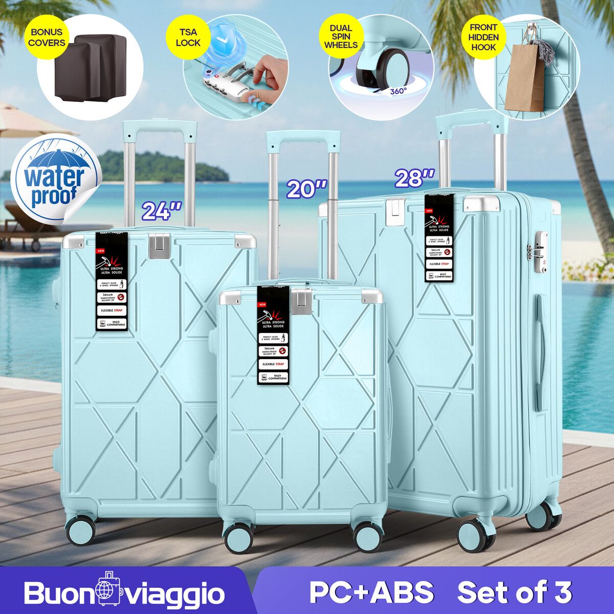 3 Piece Luggage Set Carry On Travel Suitcases Cabin Hard Shell Case Checked Bags Lightweight Hand Baggage Rolling Trolley TSA Lock Front Hook 2 Covers