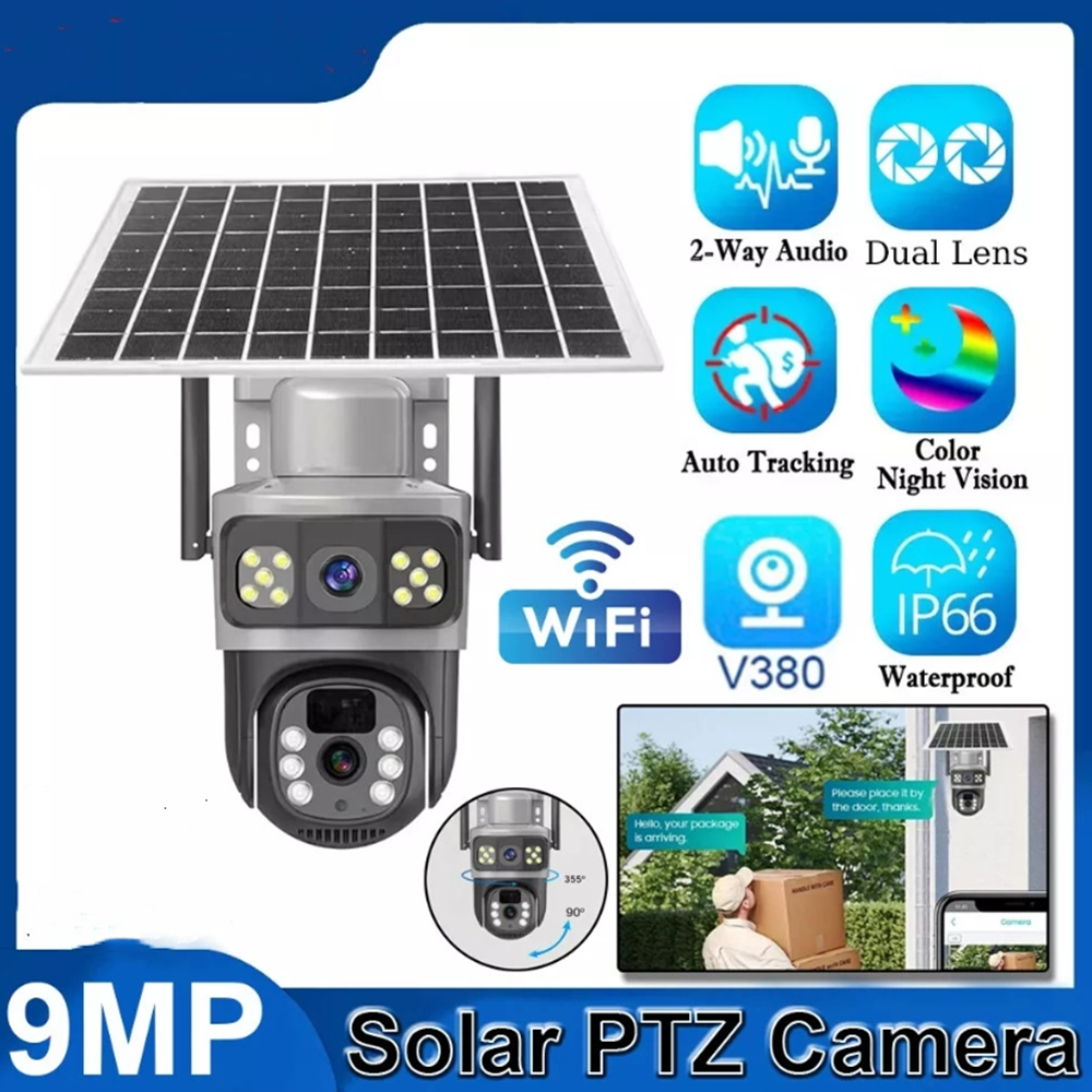 Dual Lens WiFi Solar Security Camera Outdoor Wireless Outdoor 1080P PTZ Dome Survaillance Cam 9MP Night Vision AI Motion Detection