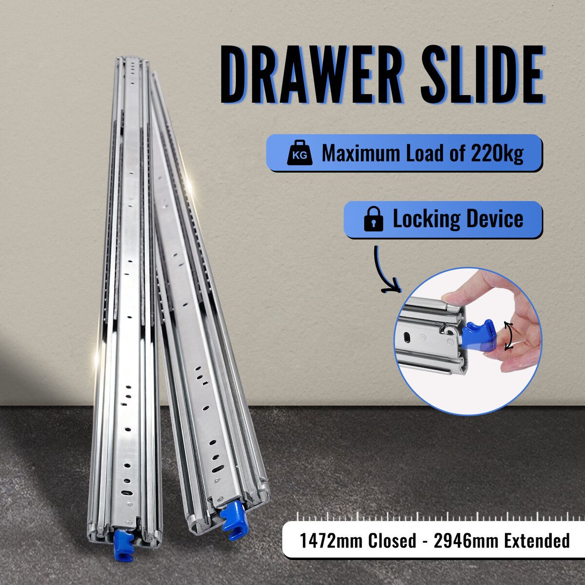 Locking Drawer Slides Runners Heavy Duty Ball Bearing Trailer Rails Track Full Extension 1472mm to 2946mm Cabinet Guide Metal 220kg RV Camper Toolbox